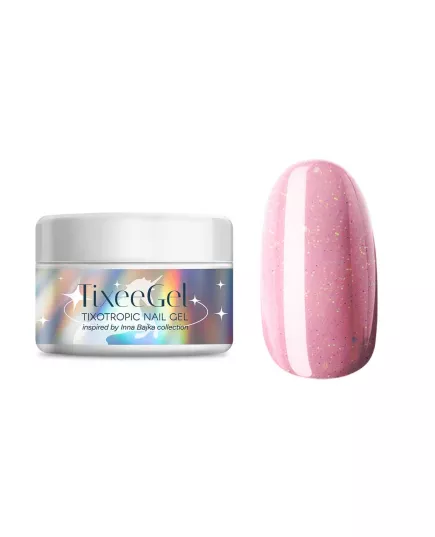 T03 – Drobny, kolorowy brokatu podbije Wasze serca! Jeśli szukacie żelu w chłodniejszych tonacjach różu ten żel sprawdzi się idealnie. Po nałożeniu go na płytkę paznokcia zobaczycie jak pięknie współgra brokat w nim zanurzony z jego kolorem.