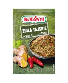 Dane produktowe Kotányi Zioła tajskie 15 g Dobre z natury Zioła tajskie to intrygująca kompozycja przypraw z dodatkiem ziół azjatyckich, charakterystycznych dla kuchni tego kraju. Wyraźny aromat mieszanki Kotányi nada Państwa potrawom nutę wyjątkowego smaku typowego dla kuchni tajskiej....