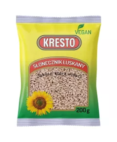 Dane produktowe KRESTO Słonecznik łuskany 200 g Słonecznik idealnie nadaje się jako szybka przekąska pomiędzy posiłkami. Można go dodać do sałatek, dań mięsnych lub makaronów. Sprawdzi się również w roli komponentu do wielu wypieków i deserów. Słonecznik idealnie nadaje się jako szybka...