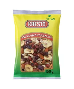Dane produktowe KRESTO Mieszanka studencka 140 g Świadome odżywianie. Studencki kwadrans wystarczy, by rozkręcić dobrą imprezę! Tu słodkie rodzynki szaleją z bananami, a migdały z orzechami tworzą klimat chrupkiego smaku. Mixuj wrażenia i baw się dobrze. MIESZANKA STUDENCKA marki KRESTO to...