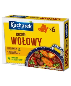 Dane produktowe Kucharek Rosół wołowy 60 g (6 x 10 g) Składniki: sól, tłuszcz palmowy, skrobia, wzmacniacze smaku: glutaminian monosodowy, 5'-rybonukleotydy disodowe, cukier, ekstrakt wołowy (2 %), barwnik: karmel amoniakalny, aromat, regulator kwasowości: kwas cytrynowy Dodatki...