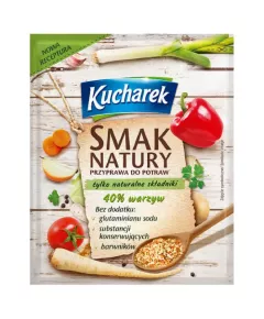 Dane produktowe Kucharek Smak Natury Przyprawa do potraw 75 g Wyjątkowo naturalny smak potraw podkreśla aromatyczna kompozycja przypraw i starannie dobranych warzyw, którą można znaleźć w opakowaniu Kucharek Smak Natury. Szczególnie polecany do: zup, mięs pieczonych, ryb, sałatek, dań...
