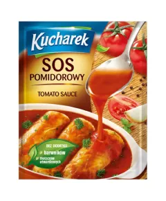 Dane produktowe Kucharek Sos pomidorowy 33 g Składniki: pomidor suszony (28,5 %), skrobia, cukier, mąka PSZENNA, sól, skrobia modyfikowana, papryka słodka, olej rzepakowy, suszony koncentrat soku buraka czerwonego, cebula, bazylia (0,3 %), pieprz czarny, kurkuma, ekstrakt papryki...