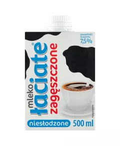 Dane produktowe Łaciate Mleko UHT zagęszczone niesłodzone 7,5 % 500 ml Składniki: MLEKO, stabilizatory: E331, E339, zawartość tłuszczu 7,5 %, Zawartość suchej masy beztłuszczowej 18 % Dodatki Marka Łaciate Dodatkowe informacje Przechowywanie Najlepiej spożyć przed:...