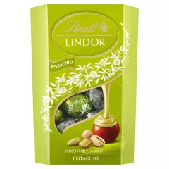 Dane produktowe Lindt Lindor Czekolada mleczna z nadzieniem pistacjowym 200 g Składniki: cukier, tłuszcz kakaowy, tłuszcz roślinny (kokosowy, z nasion palmy), MLEKO pełne w proszku, miazga kakaowa, odtłuszczone MLEKO w proszku, LAKTOZA, bezwodny tłuszcz MLECZNY, pasta z PISTACJI (1,3...