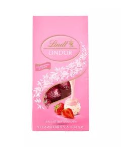 Dane produktowe Lindt Lindor Pralinki z białej czekolady z kawałkami truskawek i śmietankowym nadzieniem 100 g Składniki: cukier, tłuszcz kakaowy, tłuszcze roślinne (kokosowy, z nasion palmy), MLEKO pełne w proszku, LAKTOZA, ŚMIETANKA w proszku (1,1 %), emulgator: lecytyny (SOJA),...