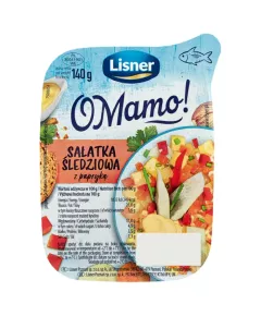 Dane produktowe Lisner O Mamo! Sałatka śledziowa z papryką 140 g Po otwarciu - produkt przeznaczony do bezpośredniego spożycia. Składniki: 37,6 % ziemniaki gotowane, olej rzepakowy, 15 % marynowane krojone filety ze ŚLEDZIA atlantyckiego (Clupea harengus) (ŚLEDŹ, cukier, sól, ocet...