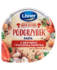 Dane produktowe Lisner Smak Sezonu Pasta z grzybami i pieczoną papryką 80 g Składniki: olej rzepakowy, 16 % JAJA gotowane, woda, 11 % pieczarki konserwowe, cebula smażona, cukier, 3 % podgrzybek marynowany, papryka czerwona pieczona, natka pietruszki, przyprawy (zawiera: SOJĘ,...