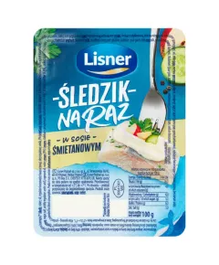 Dane produktowe Lisner Śledzik na raz w sosie śmietanowym 100 g Po otwarciu - produkt przeznaczony do bezpośredniego spożycia. Składniki: 40 % filety ze ŚLEDZIA atlantyckiego (Clupea harengus) (ŚLEDŹ, cukier, sól, regulator kwasowości: kwas octowy), olej rzepakowy, woda, 8 % ŚMIETANA...