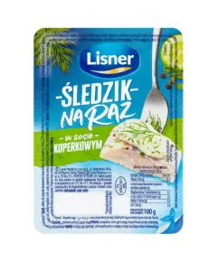 Dane produktowe Lisner Śledzik na raz w sosie koperkowym 100 g Po otwarciu - produkt przeznaczony do bezpośredniego spożycia. Składniki: 40 % filety ze ŚLEDZIA atlantyckiego (Clupea harengus) (ŚLEDŹ, cukier, sól, regulator kwasowości: kwas octowy), olej rzepakowy, woda, 7,5 % ogórek...