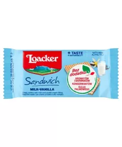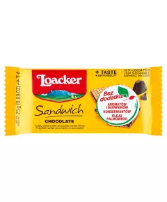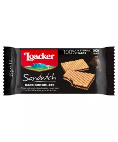 Loacker Chrupiące wafle przekładane kremem z ciemnej czekolady 25 g Chrupiące wafle przekładane kremem z ciemnej czekolady (71 %). Składniki mąka pszenna , olej kokosowy, syrop glukozowy, cukier, kakao o zmniejszonej zawartości tłuszczu, czekolada półgorzka (miazga kakaowa, cukier) 8 % w...