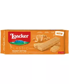 Dane produktowe Loacker Classic Chrupiące wafle z kremem z orzechów arachidowych 45 g Składniki: mąka PSZENNA, pasta z ORZECHÓW ARACHIDOWYCH 24 % w kremie, tłuszcze roślinne (kokosowy, kakaowy), syrop glukozowy, serwatka z MLEKA w proszku, mąka SOJOWA, cukier, odtłuszczone MLEKO w...