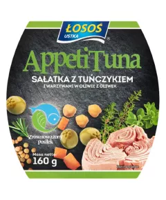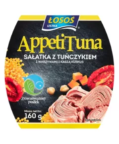 Dane produktowe Łosoś Ustka AppetiTuna Sałatka z tuńczykiem z warzywami i kaszą kuskus 160 g Składniki: 35 % warzywa w zmiennych proporcjach (marchew, ciecierzyca, papryka czerwona, cebula), 26 % TUŃCZYK rozdrobniony (Katsuwonus pelamis / obszar połowu: FAO - patrz nadruk na opakowaniu...