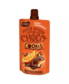 Dane produktowe Łowicz Anty Baton Choco Cookie Mus kakao + pomarańcza 100 g Składniki: przeciery z: jabłek, bananów, fasoli, zagęszczony sok pomarańczowy (5,3 %), pasta z ORZECHÓW LASKOWYCH (4,5 %), kakao naturalne (1,2 %), przecier z daktyli, zagęszczony sok cytrynowy, aromaty...