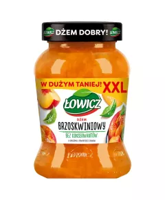 Dane produktowe ŁOWICZ Dżem brzoskwinia o obniżonej zawartości cukrów 210 g Składniki: brzoskwinie (100 g brzoskwiń zużyto na 100 g produktu), cukry pochodzące z owoców, zagęszczony sok cytrynowy do korekty smaku kwaśnego, substancja żelująca - pektyny, Sporządzono ze 100 g owoców na...