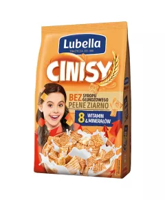 Dane produktowe Lubella Mlekołaki Cinisy Zbożowe kwadraciki z cynamonem 250 g Składniki: mąka 66%: PSZENNA pełnoziarnista 34%, ryżowa, cukier, otręby PSZENNE 6,9%, olej słonecznikowy, skrobia PSZENNA, sól, barwnik: karmel, cynamon 0,3%, aromat, regulator kwasowości: fosforany sodu,...