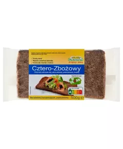 Dane produktowe Mestemacher Chleb pełnoziarnisty cztero-zbożowy 500 g Pieczywo żytnie. Składniki: rozdrobnione ziarno ŻYTNIE i mąka ŻYTNIA (42 %), woda, zakwas (22 %) (rozdrobnione ziarno ŻYTNIE, woda), mąka PSZENNA (3 %), siemię lniane, płatki OWSIANE (2 %), płatki JĘCZMIENNE (2%),...