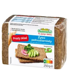 Dane produktowe Mestemacher Chleb żytni pełnoziarnisty z pestką dyni 500 g Składniki: żyto (rozdrobnione ziarno ŻYTNIE, mąka ŻYTNIA), zakwas (22%) (rozdrobnione ziarno ŻYTNIE, woda), woda, pestki dyni (3%), sól, błonnik OWSIANY, drożdże, środek do przetwarzania mąki: kwas askorbinowy...