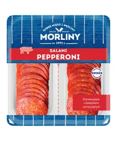 Dane produktowe Morliny Salami pepperoni 100 g (2 x 50 g) Składniki: mięso wieprzowe, słonina wieprzowa, skórki wieprzowe, białko wieprzowe (pochodne krwi, kolagen), sól, przyprawy (w tym papryka ostra 1,15 %), glukoza, ekstrakty przypraw, przeciwutleniacz (E 300), kultury starterowe,...