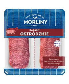Dane produktowe Morliny Salami ostródzkie 100 g (2 x 50 g) Składniki: mięso wieprzowe, słonina wieprzowa, sól, mięso wołowe, białko wieprzowe (pochodne krwi, kolagen), ekstrakt buraków, glukoza, przyprawy, maltodekstryna, bulion granulowany (zawiera: pieprz, sól, olej roślinny...