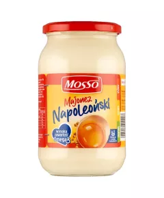 Dane produktowe Mosso Majonez Napoleoński 750 g Majonez o gęstej, kremowej i delikatnej konsystencji. Stanowi idealny dodatek do sałatek, jajek i wędlin. Nie zawiera konserwantów. Składniki: olej rzepakowy, woda, żółtko JAJA kurzego, cukier, sól, musztarda (GORCZYCA, cukier, sól, ocet...