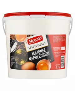 Mosso Professional Majonez Napoleoński 2,3 kg Majonez Napoleoński. Składniki olej rzepakowy z pierwszego tłoczenia, woda, żółtko jaja 6%, cukier, ocet, sól, gorczyca , substancja zagęszczająca - guma ksantanowa, regulator kwasowości - kwas cytrynowy, glukoza, przyprawy i ekstrakty...