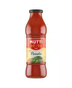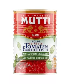 Dane produktowe Mutti Pulpa drobno krojone pomidory bez skórki z bazylią 400 g Produkt bezglutenowy i odpowiedni dla wegan Gwarancja 100 % włoskich upraw pomidorów ze słonecznych rejonów Parmy. Składniki: pomidory (98,5 %), bazylia Basillico Genovese ChNP* (1,2 %), sól, *ChNP -...