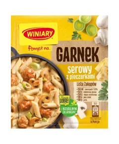 Dane produktowe Winiary Pomysł na... Garnek serowy z pieczarkami 34 g Ten produkt powstał z suszonych składników. Suszenie pozwala w naturalny sposób zachować na dłużej smak i aromat warzyw oraz ziół zebranych w szczycie sezonu. Składniki: ser w proszku 31,2 % z MLEKA, skrobia...