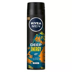 Dane produktowe Nivea MEN Deep Energy Antyperspirant dla mężczyzn w spray'u 150 ml NIVEA MEN Deep Energy Antyperspirant zapewnia uczucie suchej i czystej skóry. Formuła z Czarnym Węglem i zmysłowym męskim zapachem espresso zapewnia długotrwały zapach i niezawodną 48-godzinną ochronę...