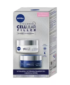 Dane produktowe Nivea Hyaluron Cellular Filler Zestaw Ekspert Wypełnienia 2 x 50 ml Zestaw na Dzień i na Noc NIVEA HYALURON CELLULAR FILLER posiada zaawansowaną formułę, zawierającą połączenie składników aktywujących komórki skóry*, Czystego Kwasu Hialuronowego i Boostera Kolagenu. Aktywuje...