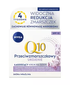 Dane produktowe Nivea Q10 Ukojenie Przeciwzmarszczkowy krem na dzień Spf15 50 ml NIVEA Q10 UKOJENIE Przeciwzmarszczkowy krem na dzień z SPF15 działa w harmonii z mikrobiomem skóry, stanowiąc pierwszą linię obrony. Formuła o udowodnionym działaniu przeciwzmarszczkowym zawiera najczystszy, w...