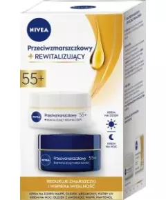 NIVEA® Przeciwzmarszczkowy + rewitalizujący krem na dzień 55+  wspiera witalność i regenerację dojrzałej, wymagającej skóry przez cały dzień. Aktywna formuła z cennym olejkiem z awokado widocznie redukuje zmarszczki od wewnątrz i wspiera proces odnowy Twojej dojrzałej i wymagającej cery....