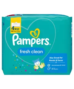Dane produktowe Pampers Fresh Clean Chusteczki 4 opakowania = 208 chusteczek Skóra Twojego dziecka jest bardzo delikatna i zasługuje na łagodne oczyszczanie, zwłaszcza najbardziej wrażliwych części ciała, takich jak pupa, rączki i buzia. Teraz chusteczki Pampers Fresh Clean zapewniają jeszcze...