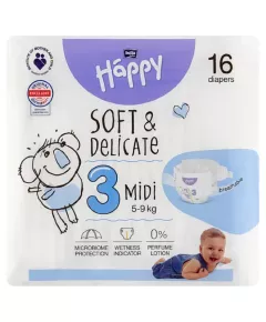 Dane produktowe Bella Baby Happy Pieluszki jednorazowe 3 midi 5-9 kg 16 sztuk Pieluszki jednorazowe. Nowoczesna konstrukcja zapewnia optymalną chłonność i wysoki komfort użytkowania. Produkt z atestem NIZP-PZH Pozytywna opinia Instytutu Matki i Dziecka nr Op-5544, ważna do 30.04.2026 r....