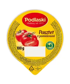 Dane produktowe Podlaski Pasztet z pomidorami 100 g Składniki: woda, mięso oddzielone mechanicznie z kurcząt 25,1 %, skóry z kurcząt 8,0 %, wątroba z kurcząt 6,8 %, olej rzepakowy, kasza manna (z PSZENICY), koncentrat pomidorowy 4,1 %, sól, białko SOJOWE, skrobia ziemniaczana, warzywa...