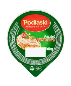 Dane produktowe Podlaski Pasztet kremowy 100 g Składniki: woda, tłuszcz wieprzowy 21 %, skóry z kurcząt 19 %, wątroba z kurcząt 10 %, kasza manna (z PSZENICY), wątroba wieprzowa 6 %, sól, białko SOJOWE, warzywa suszone (cebula, marchew, pietruszka, por), maltodekstryna, hydrolizat...