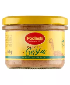 Dane produktowe Podlaski Pasztet z gęsią 160 g Składniki: mięso drobiowe 27 % (w tym z gęsi 9 %), woda, wątroba z kurcząt 19 %, skóry z gęsi 11 %, tłuszcz wieprzowy 7 %, kasza manna (z PSZENICY), cebula, sól, emulgatory: E472c, E471, przyprawy i ich ekstrakty, maltodekstryna, cukier,...