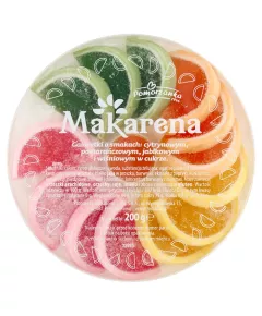 Pomorzanka Makarena Fruit of Paradise Galaretka o smaku owocowym w cukrze 200 g Składniki cukier, syrop glukozowy, woda, regulator kwasowości (kwas cytrynowy), substancja żelująca (agar), białko jaja w proszku, aromat i barwnik zgodnie z kolorem produktu: czerwony - aromat wiśniowy, barwnik...