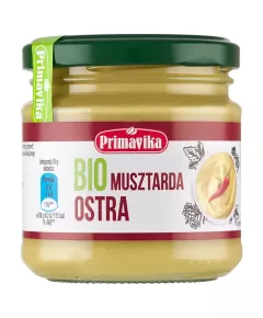 Primaeco Bio musztarda ostra 170 g Musztarda ostra Bio Składniki woda, gorczyca *, ocet zbożowy*, cukier trzcinowy*, sól morska, przyprawy*, przyprawy ziołowe*, przeciwutleniacz: kwas cytrynowy, *surowiec ekologiczny w 100 g produktu Wartość energetyczna 472 kJ / 113 kcal Tłuszcz 5,4 g w...