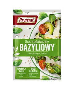 Dane produktowe Prymat Sos sałatkowy bazyliowy z błonnikiem i chia 9 g Składniki: cukier, sól, regulatory kwasowości: octany sodu, kwas cytrynowy, cebula, bazylia (6 %), błonnik cytrusowy (4 %), oregano, nasiona chia (3 %), papryka słodka, pieprz biały, natka pietruszki, aromat, olej...