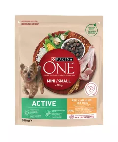 Dane produktowe PURINA ONE Mini/Small Active Karma dla psów bogata w kurczaka z ryżem 800 g Pełnoporcjowa karma dla dorosłych psów Dla małych psów prowadzących aktywny tryb życia 70 % białka pochodzenia zwierzęcego z całości białka w karmie Pomaga wspierać zdrowy mikrobiom jelit Pulpa z...
