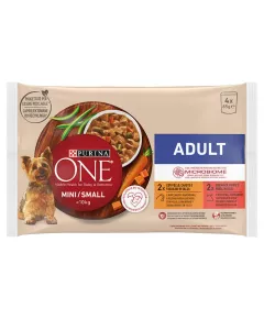 Dane produktowe PURINA ONE Mini Delicate Karma dla psów z łososiem ryżem i marchewką w sosie 400 g (4 x 100 g) Pełnoporcjowa karma dla dorosłych psów Twój mały pies ma szczególne potrzeby żywieniowe. Opracowane przez ekspertów Purina, PURINA ONE Mini/Small zapewnia wysokiej jakości...