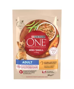 Dane produktowe Purina One Mini/Small Adult Karma dla psów 85 g Pełnoporcjowa karma dla dorosłych psów ras małych i miniaturowych do 10 kg. Składniki: mięso i produkty pochodzenia zwierzęcego (w tym kurczak 4 %), roślinne ekstrakty białkowe, ryby i produkty rybne, produkty pochodzenia...