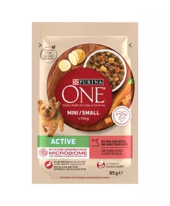 Dane produktowe Purina One Mini/Small Active Karma dla psów 340 g (4 x 85 g) Dla psów małych i miniaturowych prowadzących aktywny tryb życia. Pełnoporcjowa karma dla dorosłych psów ras małych i miniaturowych do 10 kg. Inulina pomaga utrzymać zdrowy mikrobiom jelit niezbędny dla zdrowia...