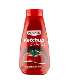 Dane produktowe Rolnik Ketchup diabelski pikantny 500 g Składniki: 38% koncentratu pomidorowego, woda, cukier, ocet spirytusowy, substancja zagęszczająca: skrobia kukurydziana i guma ksantanowa, sól, regulator kwasowości: kwas cytrynowy, przyprawy, substancja konserwująca: benzoesan...