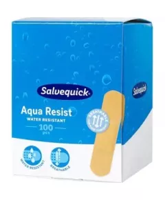 Salvequick Aqua Resist 40 szt. Wyrób medyczny Są wodoodporne, ale pozwalają skórze oddychać, Chronią ranę przed brudem i przypadkowym urazem, W zestawie jest 40 plastrów w różnych rozmiarach i kształtach, Plastry mają dyskretny, beżowy kolor....