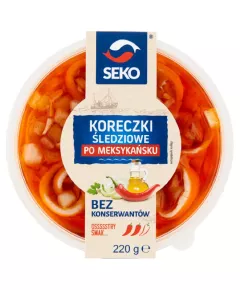 Dane produktowe Seko Koreczki śledziowe po meksykańsku 220 g Ostre dodatki, podkręcają smak śledzia Składniki: filety z A - ŚLEDZIA ATLANTYCKIEGO (Clupea harengus) lub B - ŚLEDZIA BAŁTYCKIEGO (Clupea harengus membras) - patrz nadruk przy numerze partii, olej rzepakowy, cebula, cukier,...