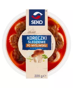 Dane produktowe Seko Koreczki śledziowe po myśliwsku 220 g Połączenie marynowanego śledzia i grzybów - to idealna propozycja dla smakoszy Składniki: filety z A - ŚLEDZIA ATLANTYCKIEGO (Clubea harengus) lub B - ŚLEDZIA BAŁTYCKIEGO (Clupea harengus membras) - patrz nadruk przy numerze...