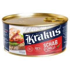 Dane produktowe Krakus Schab z chilli 300 g Składniki: mięso wieprzowe 82 % (w tym schab wieprzowy 73 %), woda, sól, skrobia modyfikowana, papryka chilli (1 %), olej rzepakowy, maltodekstryna, aromaty, aromat dymu wędzarniczego, stabilizatory: difosforany, pieprz cayenne, pieprz biały,...