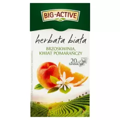 Dane produktowe Big-Active Herbata biała brzoskwinia kwiat pomarańczy 30 g (20 x 1,5 g) Intrygująca mieszanka łącząca w sobie subtelność białej herbaty i delikatną słodycz brzoskwini. Wzbogacona barwą kwiatu pomarańczy tworzy niezapomnianą w smaku kompozycję. Nasza herbata biała zapakowana...